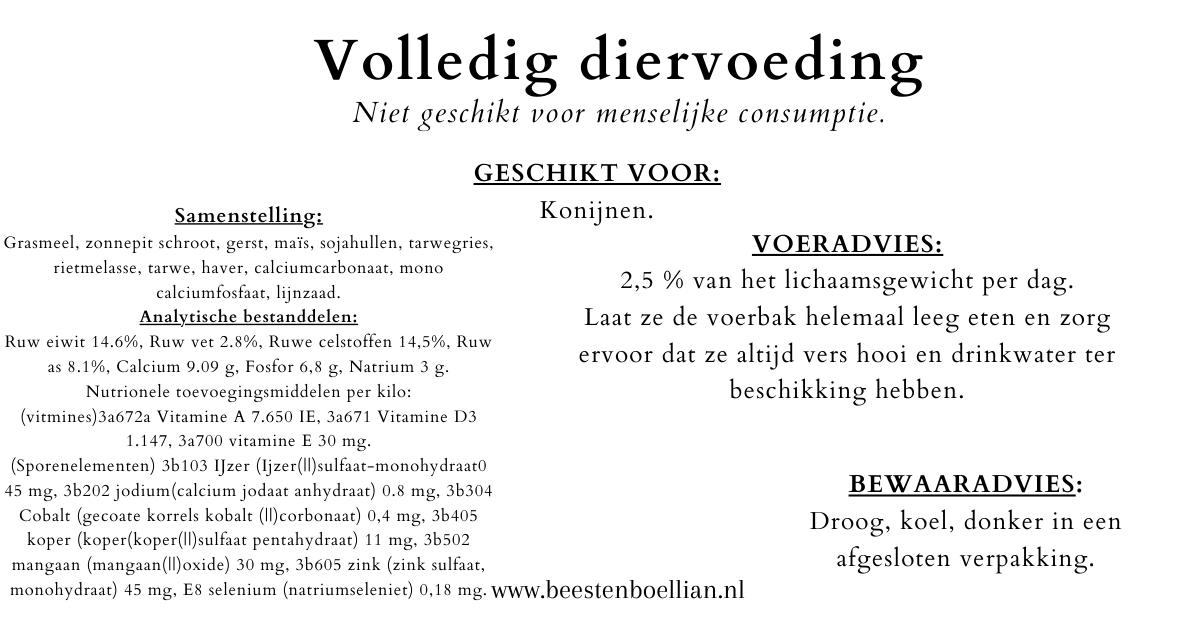Deze konijnenkorrel is gemaakt van hoogwaardige ingrediënten die zorgvuldig zijn geselecteerd om aan de voedingsbehoeften van konijnen te voldoen. Onze voeding bevat een gebalanceerde mix van vezels, eiwitten, vitaminen en mineralen om ervoor te zorgen dat jouw konijnen alle benodigde voedingsstoffen binnenkrijgen voor een gezond en actief leven.