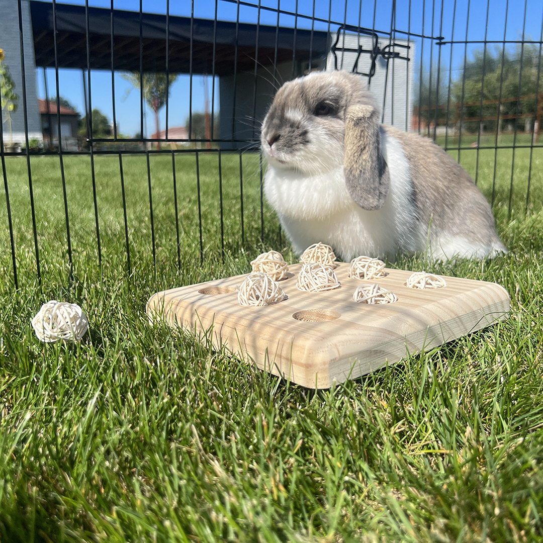 Hou je knaagdier of konijn gelukkig en geanimeerd met deze speel- en snackpuzzel van duvoplus, gemaakt van dennenhout en wilgenballetjes. Plaats lekkere snacks of voeding in de uitsparingen van de puzzel, deze beloning zal je dier stimuleren om meer te spelen en te bewegen. Houten speelgoed bevordert bovendien het natuurlijke knaaginstinct en houdt hun tandjes gezond.