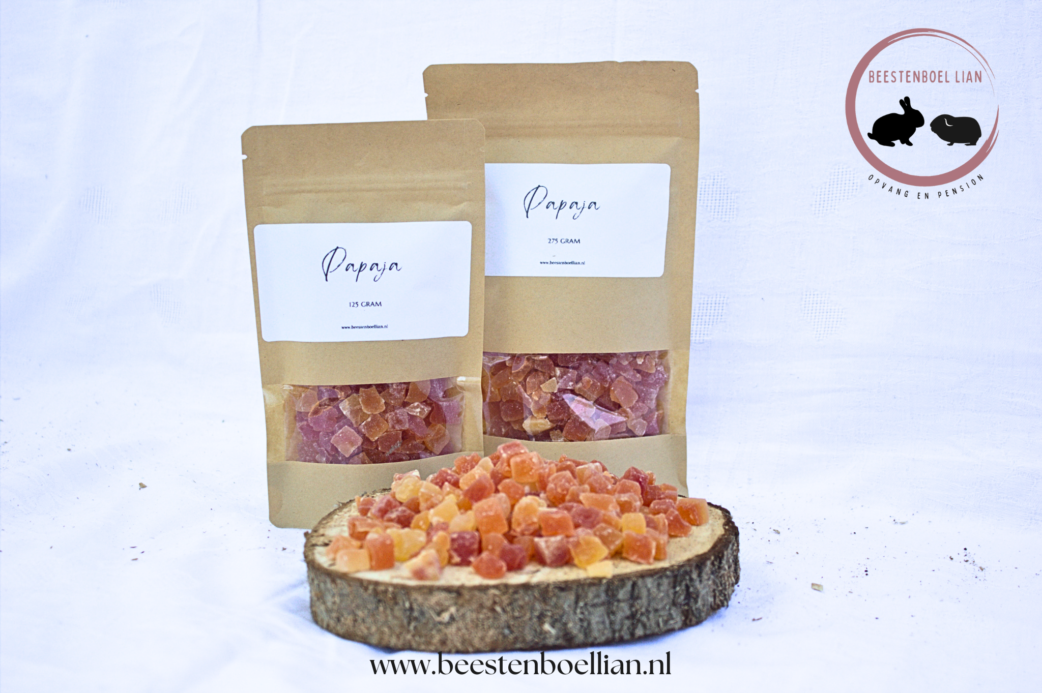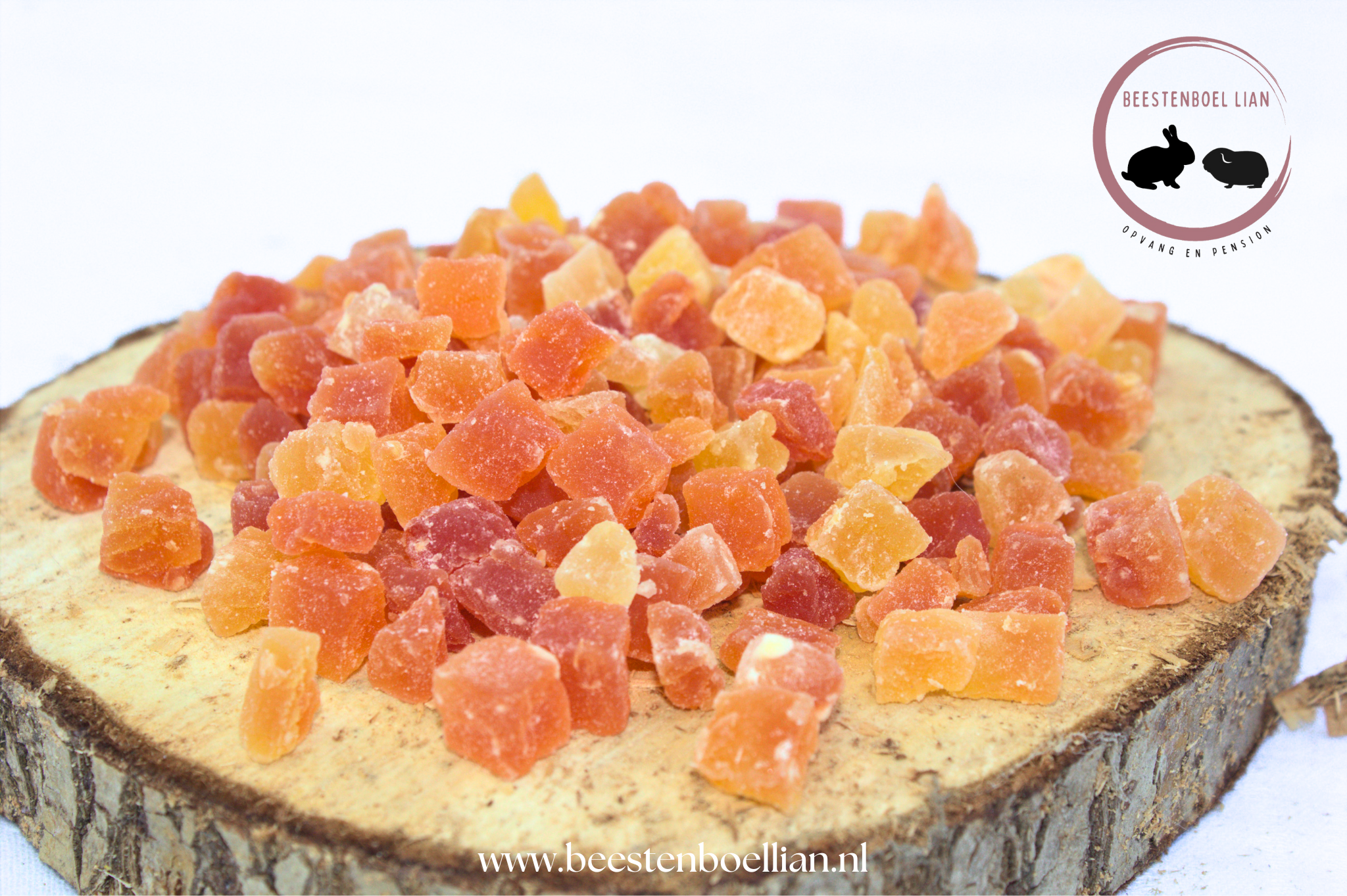 Gedroogde kleine stukjes papaja, handig om als snack te geven aan je konijn of knaagdier.\n\n\n\n